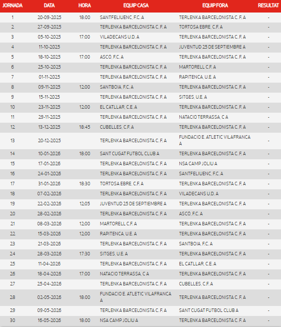 El Club Barcelonista Terlenka s’estrenarà al grup 3 de Primera Catalana visitant el camp del Santfeliuenc F. C. El partit tindrà lloc al camp de futbol Municipal Les Grases el dissabte 20 de setembre a les sis de la tarda. El conjunt dirigit per David Rodríguez tindrà davant un dels rivals més complicats de la categoria i que el curs passat va disputar el play-off d’ascens a lliga Elit.