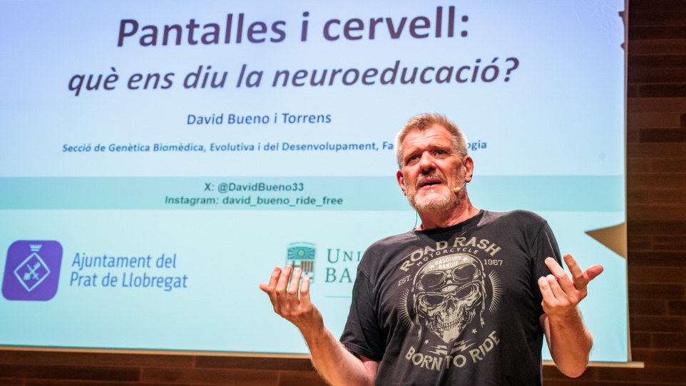 Precisament aquest tema ha protagonitzat la ponència central de la lliçó inaugural, ‘Pantalles i cervell: què ens diu la neuroeducació?’, a càrrec del doctor en l’àmbit David Bueno i Torrens. Bueno ha parlat dels perills de l’ús abusiu de les pantalles en infants i adolescents i com afecta, entre altres qüestions, als vincles i al desenvolupament cognitiu.